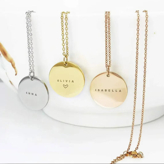 Custom Engraved Names Date Stainless Steel round Pendant Necklace Personalization Included Text Free with Chain Gift for Lovers